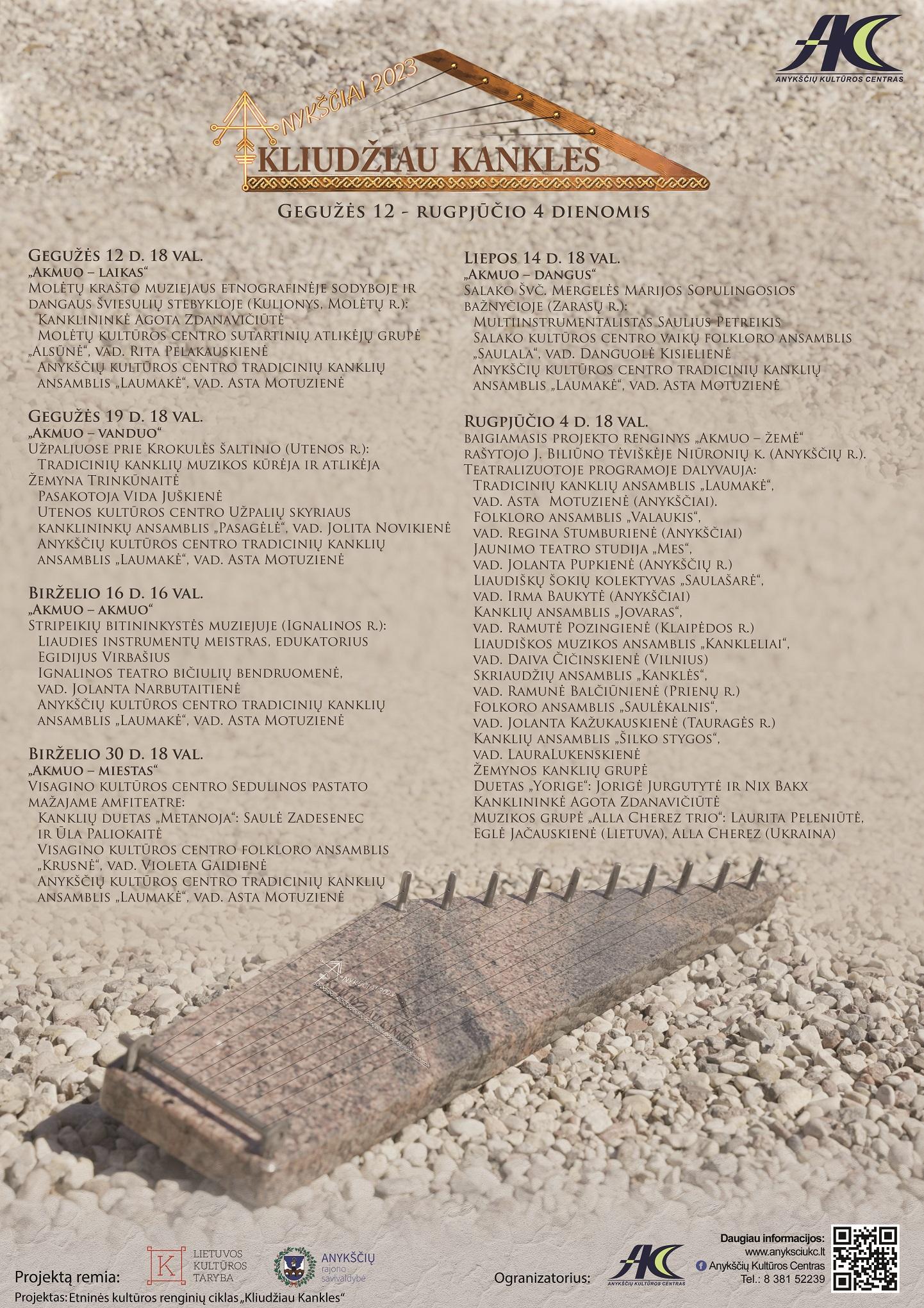 Šis projektas startavo gegužės 12 d. muzikine programa „Akmuo – laikas“ Dangaus šviesulių stebykloje (Kulionys, Molėtų r.). Kanklininkė Agota Zdanavičiūtė, Molėtų kultūros centro sutartinių atlikėjų grupė „Alsūnė“ (vad. Rita Pelakauskienė) ir Anykščių kultūros centro tradicinių kanklių ansamblis „Laumakė“ (vad. Asta Motuzienė) kvietė pasinerti į magišką kanklių muzikos ir sutartinių ratą. Gegužės 19 d. prie stebuklingo Krokulės šaltinio (Užpaliai, Utenos r.) muzikinėje programoje „Akmuo – vanduo“ skambėjo kanklių melodijos ir legendos: tradicinių kanklių muzikos kūrėja ir atlikėja Žemyna Trinkūnaitė, kanklininkė Dalia Šukienė, pasakotoja Vida Juškienė, Utenos kultūros centro Užpalių skyriaus kanklininkų ansamblis „Pasagėlė“ (vad. Jolita Novikienė) ir Anykščių kultūros centro tradicinių kanklių ansamblis „Laumakė“ (vad. Asta Motuzienė). Birželio 16 d. Bitininkystės muziejuje Stripeikiuose (Ignalinos r.) kanklių melodija susipynė su poezija muzikinėje programoje „Akmuo – akmuo“. Ignalinos teatro bičiulių bendruomenė (vad. Jolanta Narbutaitienė) ir Anykščių kultūros centro tradicinių kanklių ansamblis „Laumakė“ (vad. Asta Motuzienė) muzikinėje – poetinėje kompozicijoje pagal Justino Marcinkevičiaus eiles „Paskui rugį ir meilę“ kvietė žiūrovus kitaip pažvelgti į gyvenimą. Į pažintinę kelionę po liaudies instrumentų karalystę vedė edukatorius, instrumentų meistrystės virtuozas Egidijus Virbašius.