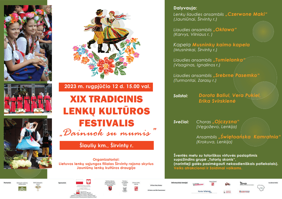 XIX tradicinis lenkų kultūros festivalis „Dainuok su mumis”2023 m. rugpjūčio 12 d. 15 val.Šiaulių k., Širvintų raj. Navigacija tarp įrašųLiūdime dėl Janinos Garbatavičienės mirties Meteorų lietus Lietuvoje: kur ir ką stebėti