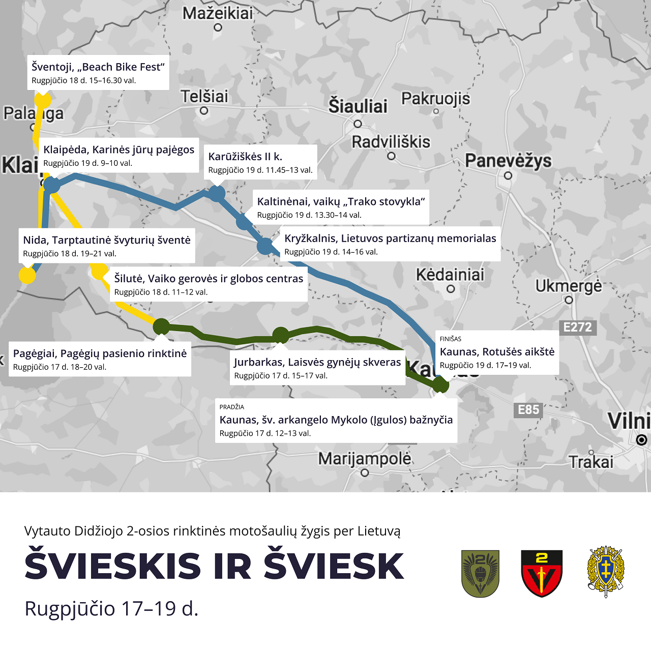 „Žygio metu Pagėgiuose susitiksime su Valstybės sienos apsaugos tarnybos pareigūnais – šauliai yra nuolatiniai pasieniečių talkininkai, taip pat užsuksime pabendrauti su Šilutės Vaikų gerovės ir globos centro vaikais bei jaunuoliais, parodysime motociklus, papasakosime apie Šaulių sąjungą. Šventojoje įsiliesime į „Beach Bike Fest 2023“, – motošaulių planus atskleidžia O. Verygaitė.