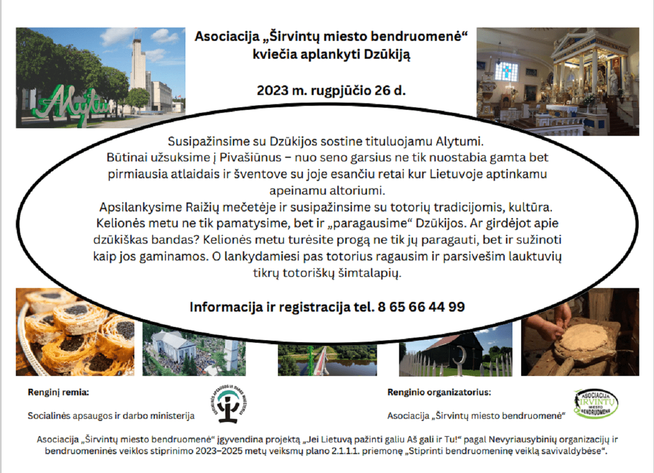Primename, kad jau šį savaitgalį (šeštadienį, rugpjūčio 26 d. ) keliaujame pasižvalgyti po Dzūkijos kraštą. Kelionė projektinė (lėšas skiria Socialinės apsaugos ir darbo ministerija), tad kelionės išlaidas apmokame iš projektinių lėšų. Lankomi objektai tikrai įdomūs: Raižių mečetė ir įdomus Raižių totorių bendruomenės pirmininko Ipolito pasakojimas apie totorių tradicijas; tikro totoriško šimtalapio degustacija; apie Alytaus miestą savo žiniomis dalinsis vietinis gidas; apie garsiąją Pivašiūnų bažnyčią, jos retą altorių ir stebuklingą Dievo Motinos paveikslą mums papasakoti sutiko pats Parapijos klebonas mons. Vincas Baublys; o su dzūkišku kulinarijos paveldu – bulvinėmis bandomis – susipažinsime Pivašiūnų amatų centre. Ir tai dar ne viskas – kai kurias detales paliekame intrigai.