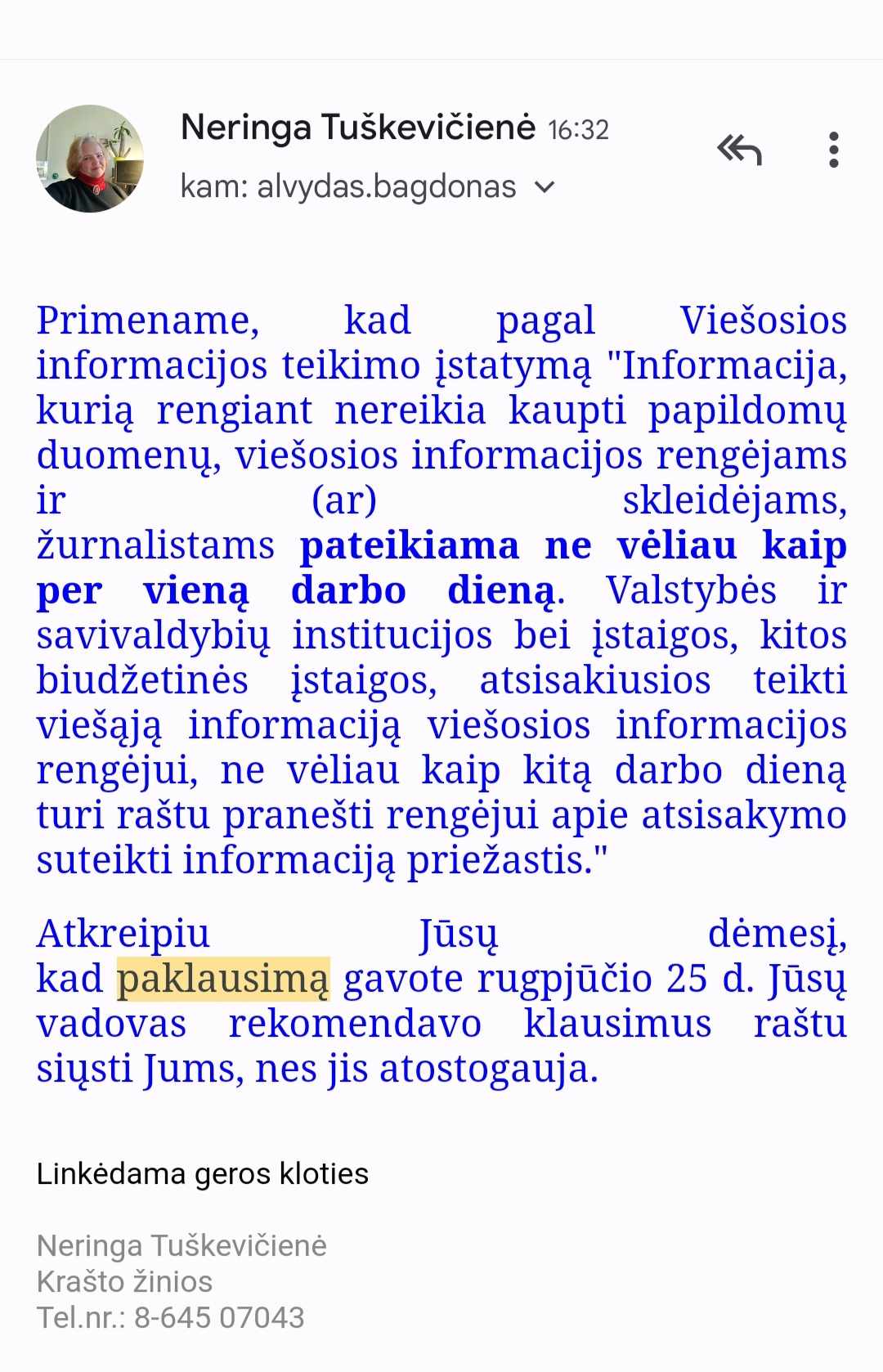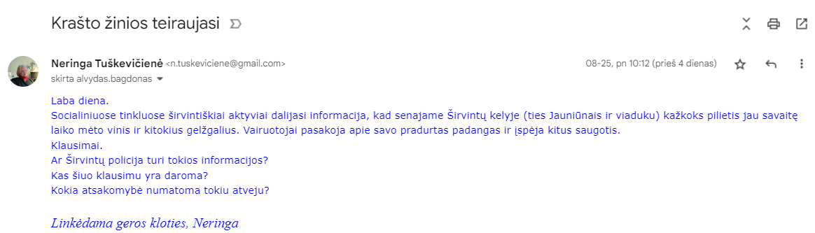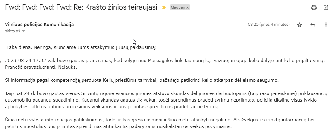 Pasirodo, dar rugpjūčio 24 d. policijai parašytas pirmas pareiškimas. Penktadienio rytą parašėme paklausimą apie įvykį (viršininko nurodytu el.pašto adresu), tačiau atsakymo negavome net pirmadienį. Parašius griežtą priminimą apie pareigą laiku atsakyti – atsakymo sulaukėme antradienį.