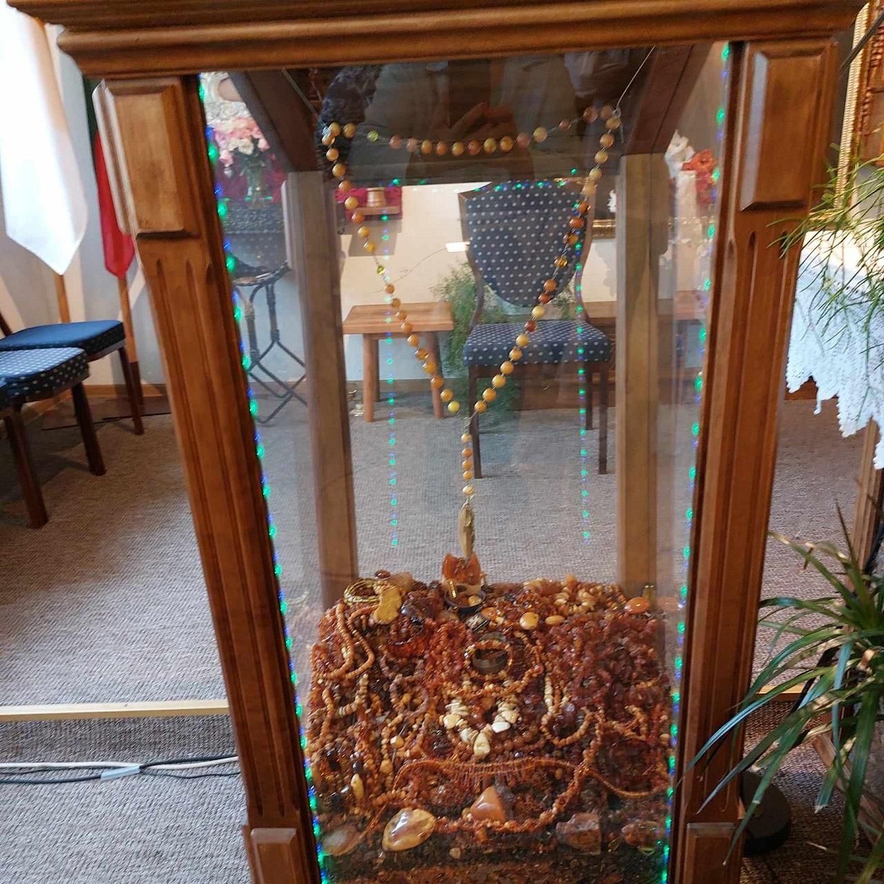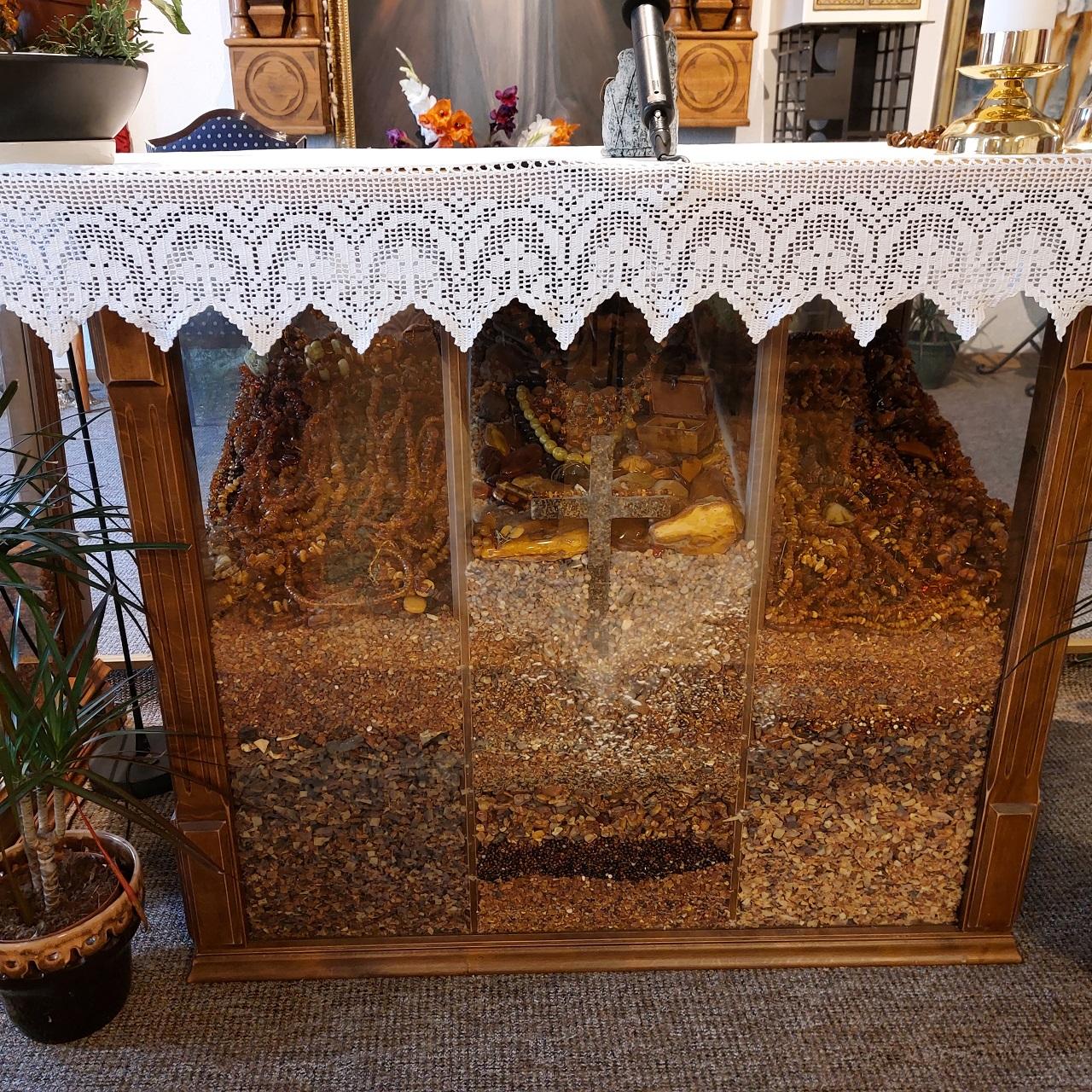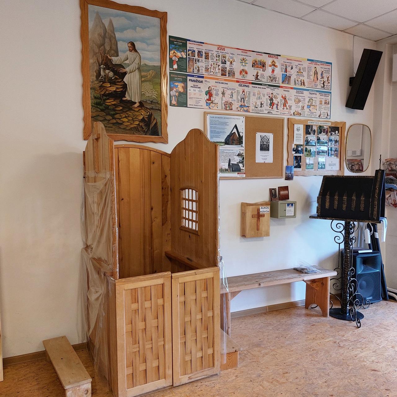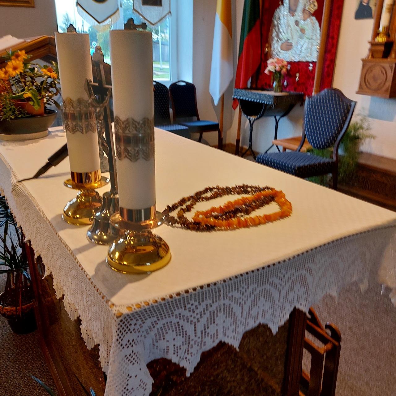Sekančią dieną aplankėme Vidmantų koplyčią, kur kunigas Karolis Petravičius- parapijos klebonas originaliais būdais, atliekant savo kūrybos dainas ir giesmes, tapant paveikslus, renka lėšas pradėtos bažnyčios statybai. Kaip pasakojo bibliotekos darbuotoja (su klebonu susitikę nebuvome) klebonas susapnavo sapną – nuostabų šviečiantį gintarinį altorių. Tai įkvėpė besilankantiems koplyčioje paaukoti gintarų.