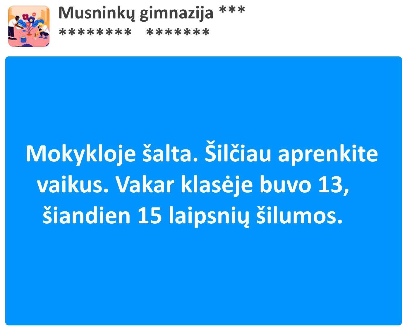„Mokykloje šalta. Šilčiau aprenkite vaikus, nes vakar klasėje buvo 13, o šiandien 15 laipsnių šilumos”