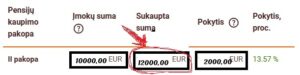 Pasižymime Sodros ir valstybės sumokėtas įmokas. Šiuo atveju 3000 ir 1700 eur. Dabar tiesiog iš visų sukauptų pinigų atimame Sodros ir valstybės pinigus ir gauname savo pinigus, kurie bus pervesti į sąskaitą. Šiuo atveju: 12000-3000-1700= 7300.